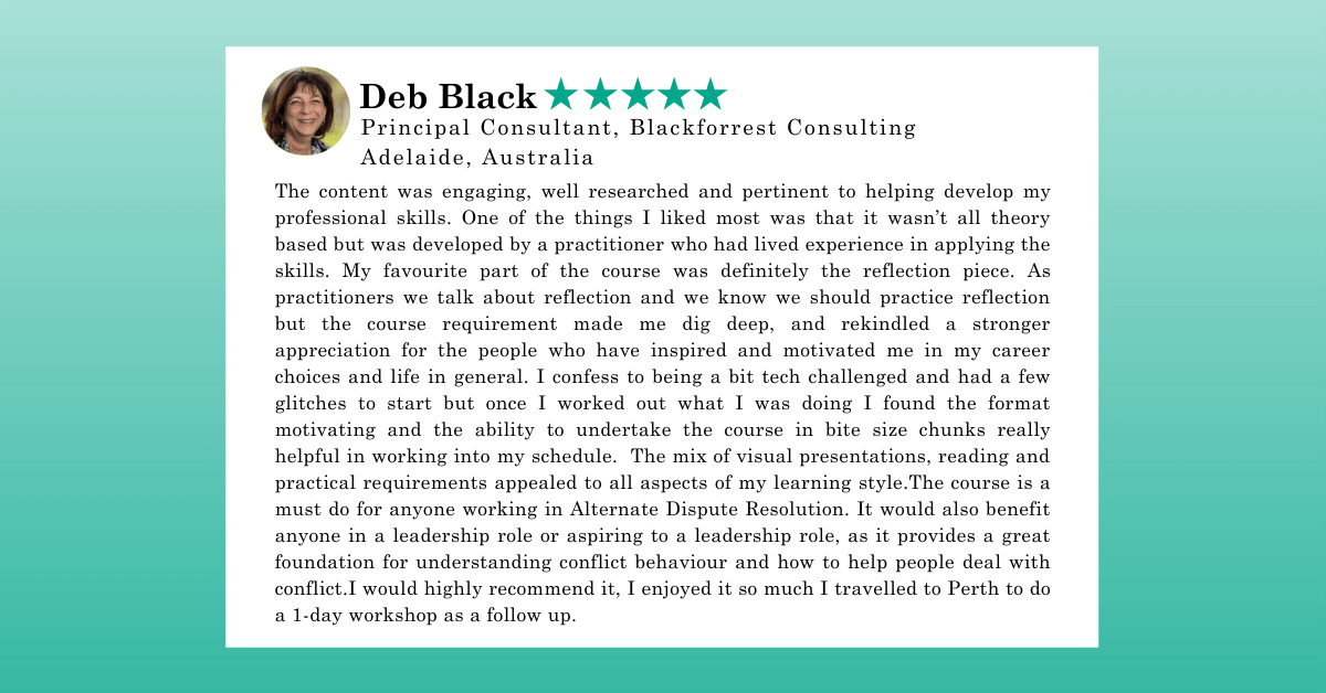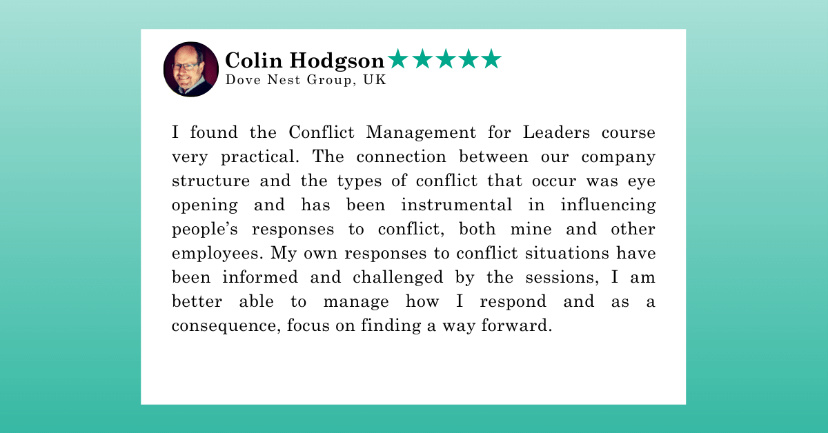 Our core purpose is to change the way people think about conflict, so that they can change the way they manage it. This creates opportunities for learning, growth and connection… and a more peaceful future.