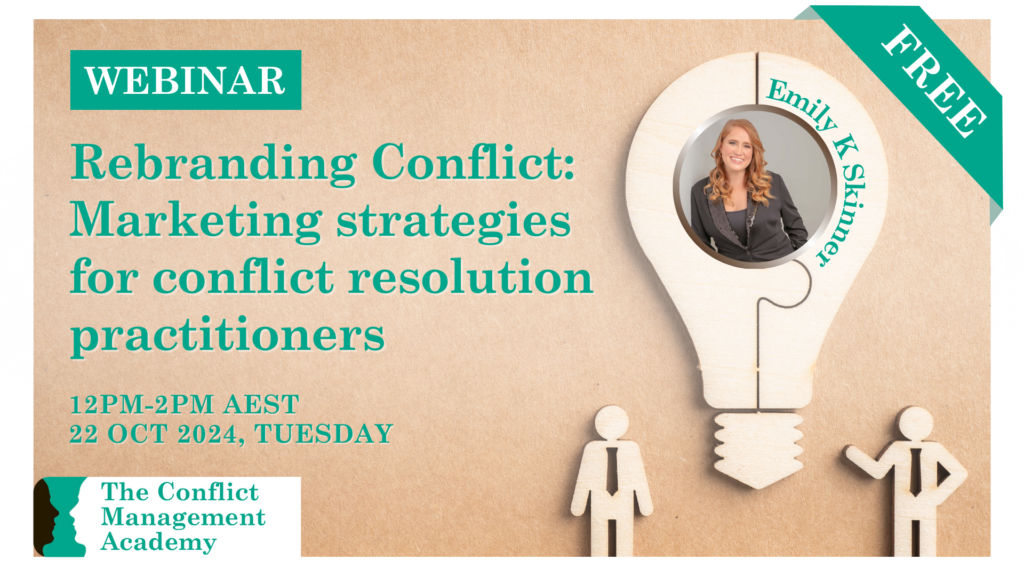 In her thesis, Emily comes up with some persuasive arguments to explain the conundrum that there is a high social need for conflict resolution services, but low market demand. She identifies practitioners’ assumptions, expectations and knowledge about conflict and conflict resolution and how they influence the way practitioners market their services. She also interviews millennials (the fastest growing target market in the next ten to fifteen years) and notes the very different way they think about conflict and conflict resolution. She highlights the mismatch between the way practitioners attempt to communicate with their market and what is likely to attract millennials’ attention.