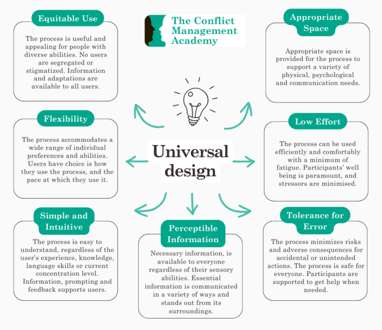 For example, in building design, wider doorways make it possible for someone with a wheelchair to enter a building easily without assistance, while at the same time making it easier for someone who does not have a disability but is carrying groceries or moving furniture. An example for dispute resolution practitioners, is when you adapat your practice to include online options, this supports people who are unable to access a physical mediation room, but also provides opportunities for those in rural areas or who prefer the convenience of participating from a location of their choice. Online options also feel safer and more comfortable for some individuals, who may not want to always share their reasoning for opting for a virtual session.