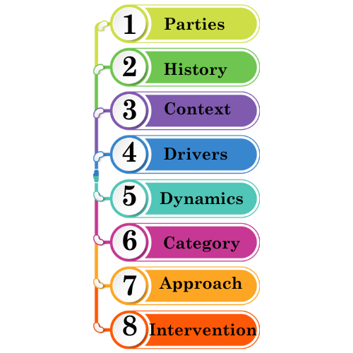Focusing on long term strategies to manage the conflict by considering how the conflict may play out overtime. Looking at a conflict through an analytical lens and framework helps the user to determine if the issues in the conflict are suited to resolution or require alternative approaches to manage the conflict.
