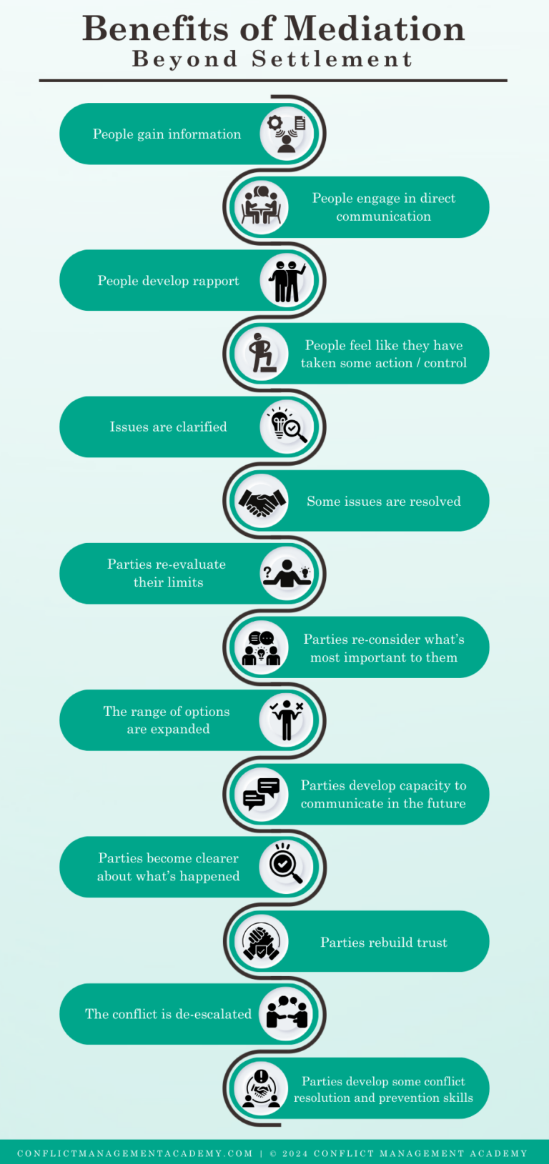 Instead of advertising settlement rates, or promoting settlement as the main benefit of processes such as mediation, consider how you might inform prospective clients of the broader range of outcomes and benefits of mediation.