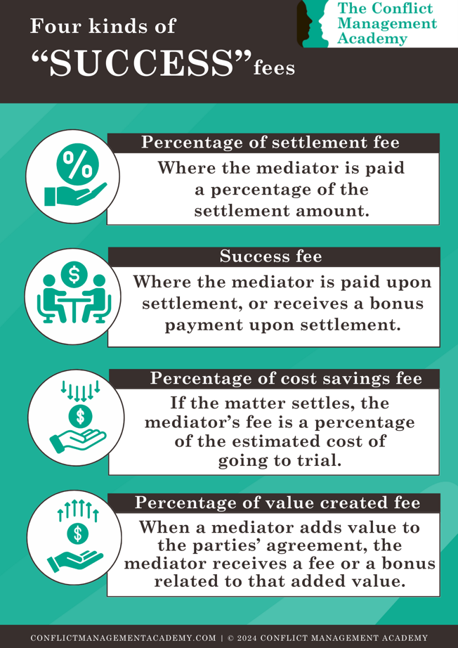 2. Success fee: Where the mediator is paid upon settlement, or receives a bonus payment upon settlement.