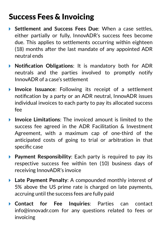 Recently, the newly launched Swiss-based InnovADR also advertises no settlement, no fee policy. Similarly to InterMediation, clients who engage in mediation through InnovADR do not pay if the matter does not settle, but InnovADR pays their mediators for their time irrespective of the outcome of the mediation. This is how their website explains their fee structure: