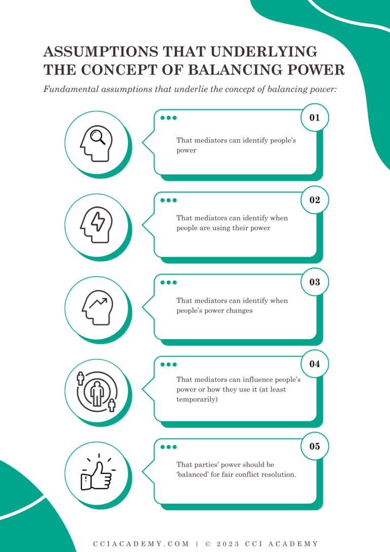 The concept of balancing power is based on some fundamental (and I suggest flawed) assumptions about power, its use, and what the mediator can do with it. The infographic below summarises the five main assumptions (and there may well be more):