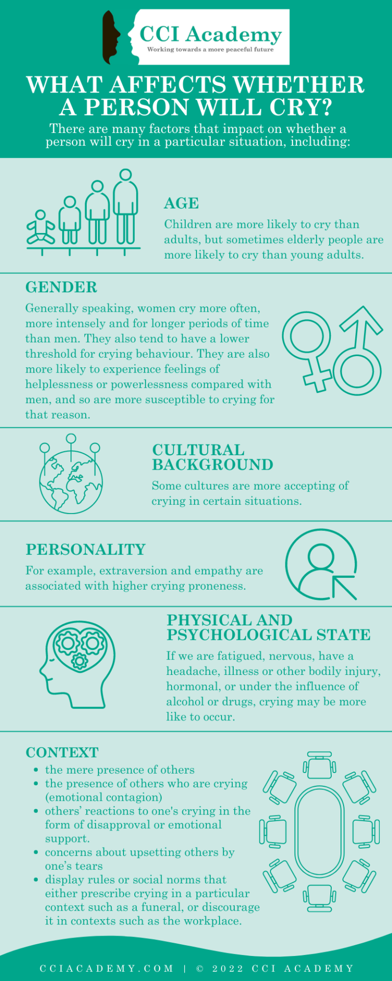- The perceived cause of the crying (for example, crying because of a significant personal loss is typically met with understanding and empathy, whereas triggers related to self-pity, incompetence, or failure, typically lead to relatively strong negative reactions from others).