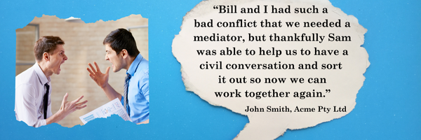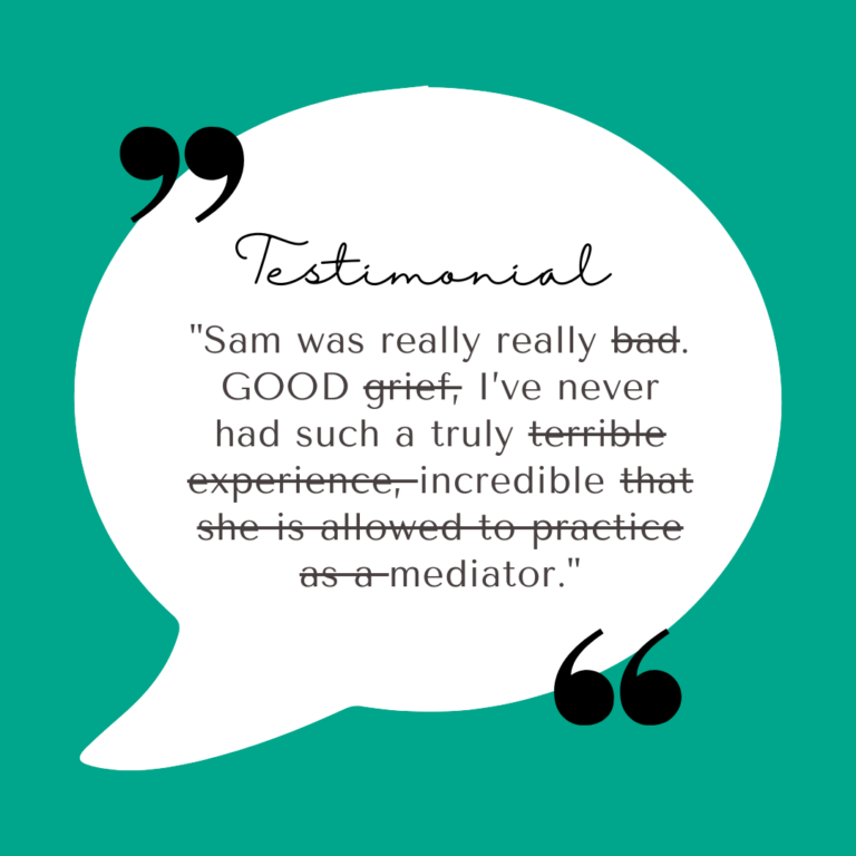 All of these points could be made about conflict resolution practitioners. Whether or not someone found a conflict resolution service effective is a very personal opinion, that could depend on the outcome of the service, or how they felt treated during the process. It is also definitely the case that the outcomes experienced by one client do not necessarily reflect the outcomes available to all clients. For example, the fact that one client settled every aspect of their conflict and felt like the outcome was win-win and their relationship with the other person improved, is not necessarily an outcome that is available (or even the best outcome) for other clients. Also, practitioners are not likely to receive a testimonial from someone who didn’t value the service they received, and if they did, are unlikely to publish that feedback, so people who see published testimonials will only see the practitioner’s feedback through selective and rose-coloured glasses. Finally, in a field such as conflict resolution services, the public do not understand what is involved or what outcomes are possible, and so may misinterpret testimonials as indicating, for example, that the practitioner can almost certainly help them to resolve their conflict.