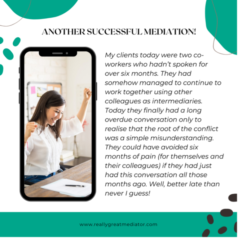 Some mediators describe on social media mediations they have just conducted in general, de-identified terms, but it is still possible that if the clients involved saw such a social media post immediately after their mediation, they may feel that someone may connect the dots and realise that it related to their conflict.