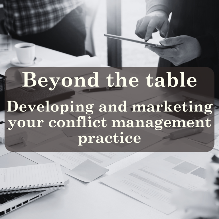 Would you like to know more about developing and marketing your conflict practice? Our Beyond the Table course includes more than 20 hours of content, including interviews with a broad range of conflict practitioners, and workbooks to apply your learning immediately to your own practice. Find out more and register here: https://conflictmanagement.tangiblelaunchpad.com/beyond-the-table-course/