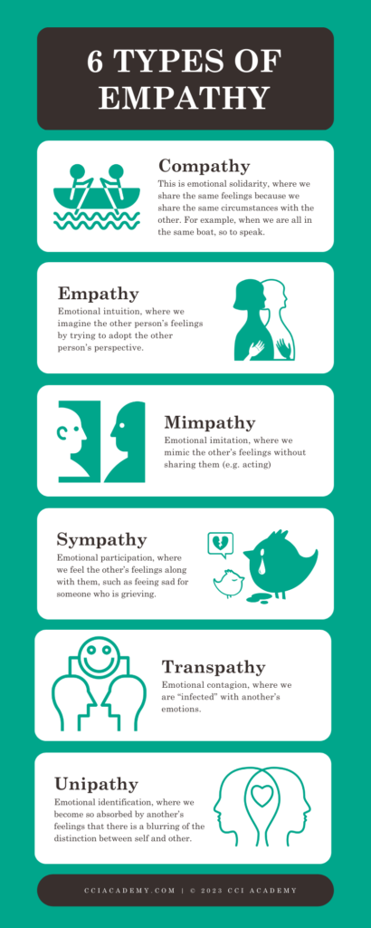 All of these different types of empathy involve some kind of sharing of emotions between people, except perhaps for mimpathy which is more about appearing to share another’s emotions than a real attempt to experience them. However, mimpathy can sometimes lead to the actor experiencing the emotions that they were attempting to mimick. For example, method actors are trained to actually experience their characters’ emotions. Is it just a coincidence that so many actors who played characters who were in love in a movie actually ended up in a relationship?