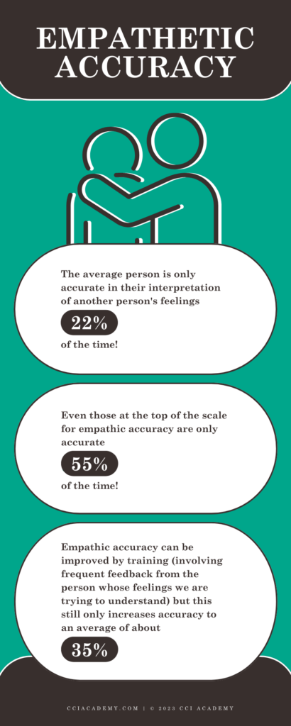 Interestingly, studies that assess how accurate people are at recognising other’s feelings find that on average, people are reasonably accurate only about 22% of the time. Even those who are at the top of the scale for empathic accuracy are only accurate 55% of the time.