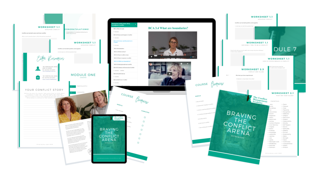The full Braving the Conflict Arena course includes about 4 hours of video content in total (presented in short lessons of about ten minutes each). There are also activities to complete for each lesson in the workbook provided.