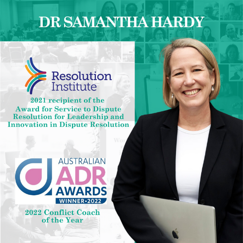 Dr Samantha Hardy is the principal of Conflict Coaching International, and the Director and Lead Trainer for The Conflict Management Academy. She is an experienced mediator and conflict coach and the founder of the REAL Conflict Coaching System™. She provides conflict support to managers and leaders across the world. She also provides professional development training, supervision and mentorship to mediators and coaches who work with clients in conflict.