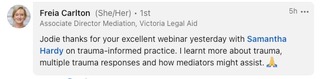 Sam has been accredited as a mediator under the Australian National Mediation Accreditation System and is a Certified Transformative Mediator by the US Institute of Conflict Transformation. She is a Certified Narrative Coach.